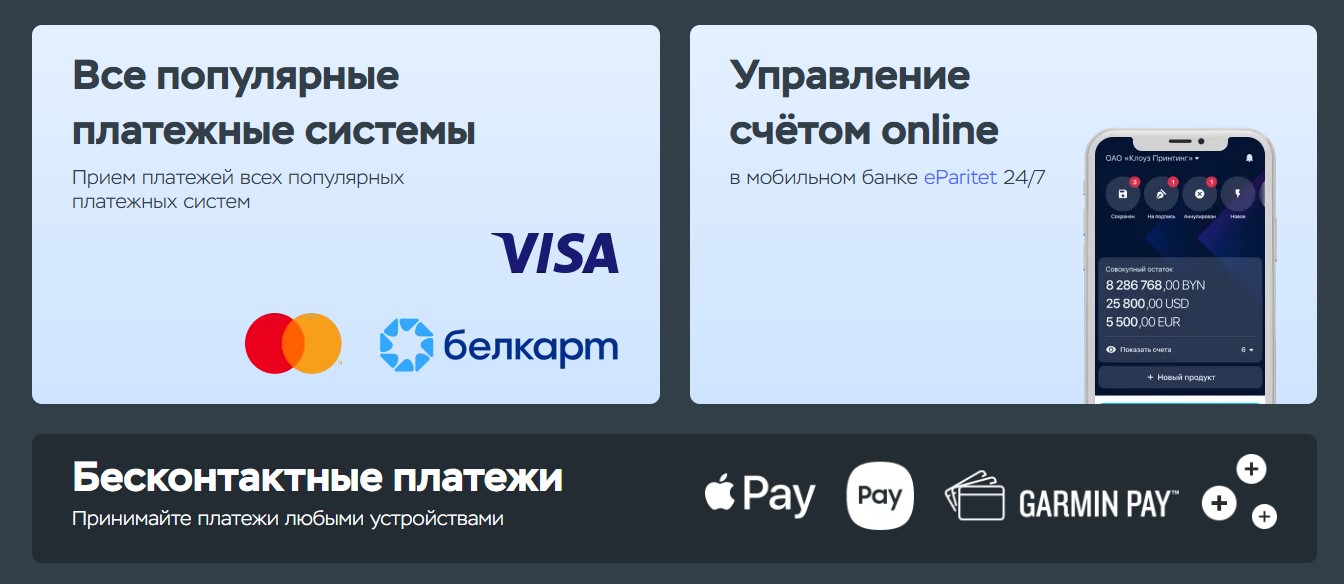 Устройства 4 в 1 позволяют принимать платежи всех популярных систем: Visa, Белкарт, Mastercard. Пользователи могут рассчитываться смартфоном или смарт-часами, которые подключены к сервисам Apple Pay, Garmin Pay и др. Такая вариативность оплаты повышает клиентоориентированность бизнеса, а значит, способствует его развитию.